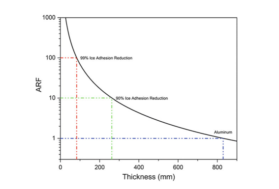 1、ARF越高,冰自行脫落效果越好,當ARF達到100,冰的附著力降低了99%,冰累積的厚度也不會超過83mm, 因為達到這個厚度冰就會自行脫落。